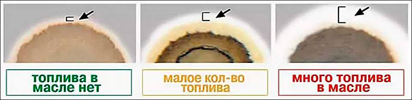 Также капельный тест можно проводить на бумаге. Для этого двигатель снова прогревают, после чего достают щуп и капают на чистый лист бумаги. Масляная капля должна сохранять свою форму, поскольку в ней присутствует вязкость, которая не дает молекулам растекаться. Если же в жидкости присутствует бензин, то пятно будет быстро растекаться.