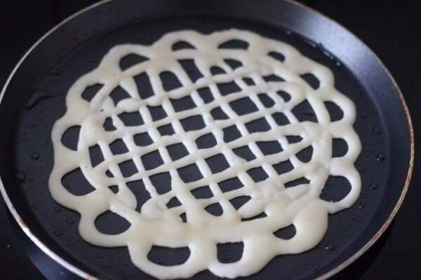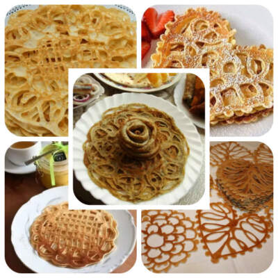 Секрет в том, что тесто наливают на сковородку из пластиковой бутылки, проделав в крышке небольшое отверстие. Тонкой струйкой теста рисуются самые разнообразные рисунки, блинчикам придается форма цветка, сердца, паутинки и т.д.