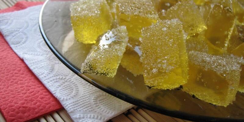 Ингредиенты: 300 г свежей бамии, 100 г сахарного песка, 3 г лимонной кислоты, 30 г желатина, 600 мл воды. Приготовление: Свежие стручки бамии промыть