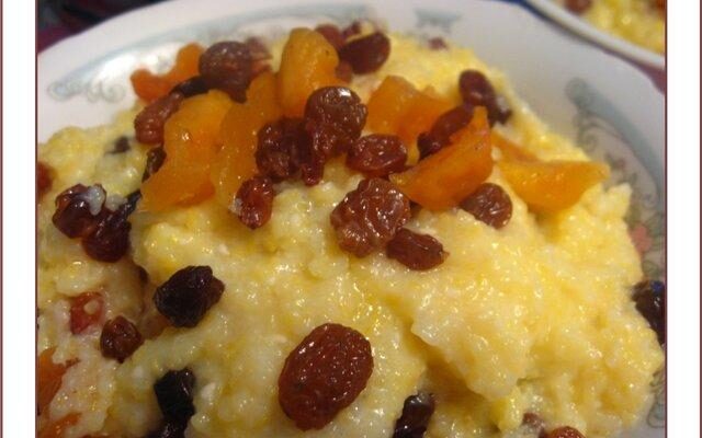 Ингредиенты: кукурузная крупа – 200 гр., сухофрукты (изюм, курага, чернослив без косточек) – 200 гр., сахар-песок – 1 ст.л., молоко – 1 л, соль по вкусу.