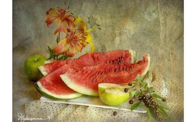 Ингредиенты: зрелые арбузы, яблоки, ржаная солома, листья вишни и черной смородины, 700-800 гр. соли на 10 л воды, промытый песок. Приготовление: Зрелые