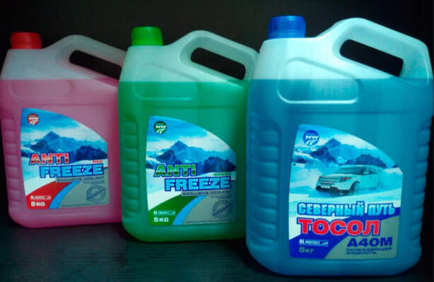 Тосол может выпускаться не только зеленого, но и красного цвета. Отличие заключается только в температуре замерзания. В красном тосоле концентрация этиленгликоля выше, поэтому жидкое состояние антифриза сохраняется до температуры -65˚С. Синяя или зеленая незамерзающая жидкость рассчитана на эксплуатацию до температуры -40˚С.