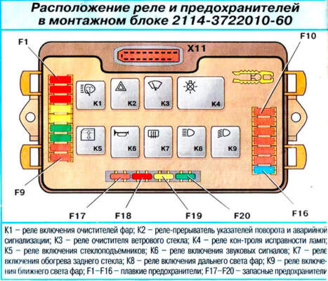 Блок реле располагается под капотом со стороны левого ветрового стекла. Раньше большинство предохранителей были плавкими, из-за чего они быстро выходили из строя. Но сейчас используются биметаллические предохранители. Также схема почти не отличается от карбюраторной версии, равно как от типа используемого трамблера ВАЗ 2109.