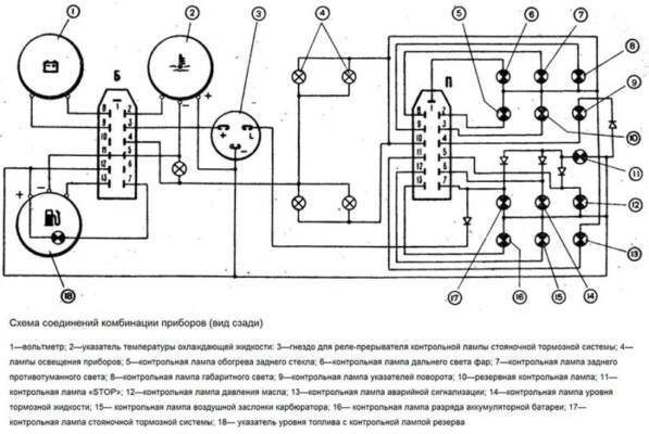 Рассматриваемая электрическая схема с высокой панелью имеет несколько отличий от стандартного варианта. Основное отличие заключается в том, что жгут белых проводов соединяется в одну систему, подключается к выключателю освещения приборов. А концы черных проводов сведены в отдельные точки, через которые они подключаются к массе.