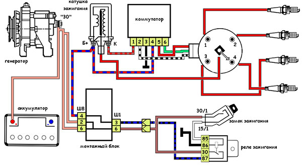 В первом случае на схеме имеется катушка и распределитель, которые и отвечают за зажигание, равно как запуск ДВС. На инжекторной версии на схеме имеется специальный модуль. В него входят две катушки, которые управляются отдельным электрическим прибором.