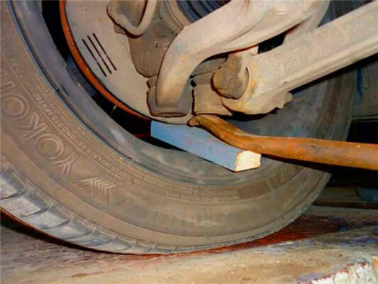 • Разместить между проушиной поворотного кулака и рычагом опоры монтировку, отрезок арматуры или трубы небольшого диаметра.