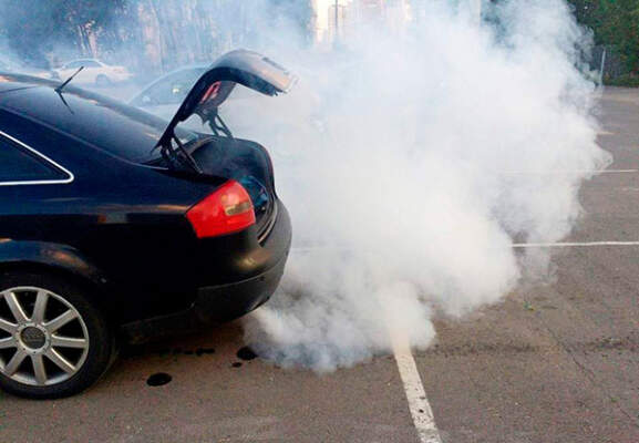 - Изменение цвета выхлопных газов. Как правило, на наличие газа в системе охлаждения указывает белых дым из трубы. Связано это с тем, что при пробитии прокладки ГБЦ охлаждающая жидкость попадает в цилиндры и выводится в виде пара через выхлопную трубу. Через образовавшееся отверстие выхлопные газы поступают в патрубки, вызывая пробку.