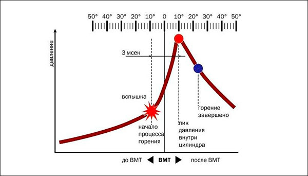 Ранний угол зажигания – Топливо возгорается раньше положенного времени, когда положение поршня далеко до ВМТ. При такой работе мотор буквально поглощает бензин литрами, а мощности выделяет намного меньше. Плюс ко всему, возникает противодействующая сила на поршень, который движется вверх.