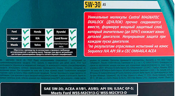 - WSS-M2C913-A (идентификация с SAE 5W-30, а также ILSAC GF-2, ACEA A1-98 и B1-98)