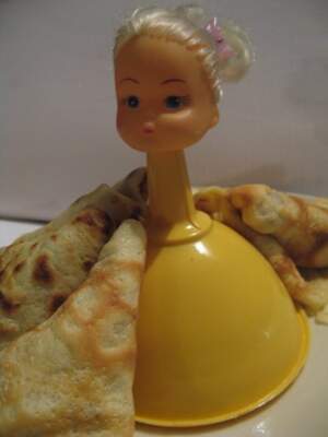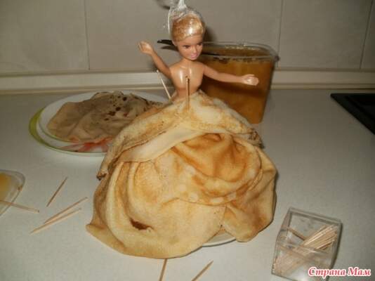 Во втором варианте кукла из блинов делается с помощью воронки и игрушечной головки.