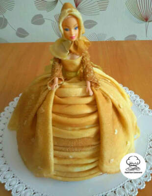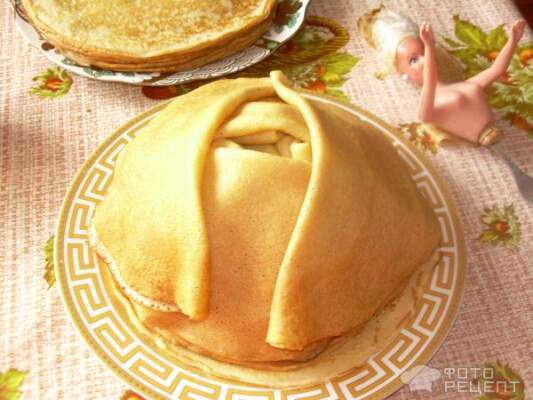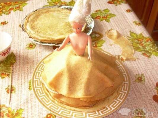 - Блины, свернутые пополам или вчетверо, накладываем на тарелку горкой, формируя основание юбки. Сверху накрываем одним расправленным блином, аккуратно драпируя складки.
