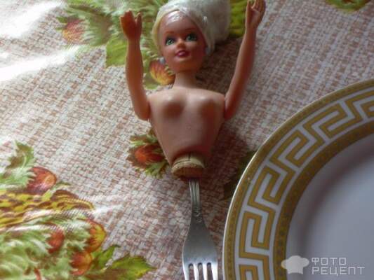 Кукла используется не целиком: к воронке берется только голова, к вилке/шпажке – верхняя часть (до талии). Как минимум, снимаются ноги — их заменяют на все те же деревянные шпажки.