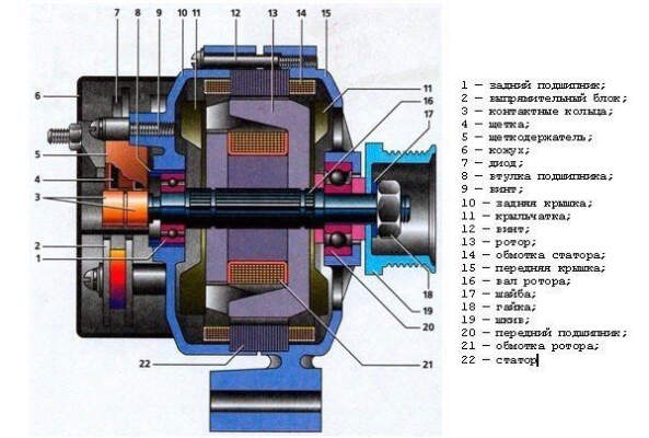 Конструктивно устройство автомобильного генератора достаточно сложно и включает множество ответственных компонентов. Является коллекторным двигателем, который работает наоборот. В устройство генератора входят элементы: