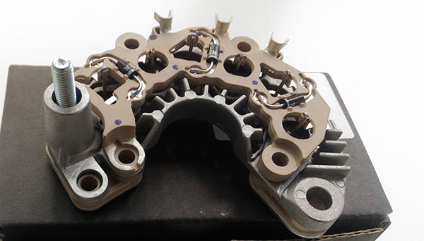 В задней крышке располагается выпрямительный блок или он же диодный мост. Узел состоит из 6 диодов, собранных в классическую схему трехфазного выпрямителя. К ним подается ток из статорных обмоток, где он выпрямляется за счет пропускания только одной полуволны и далее он поступает на регулятор напряжения. Диодные мосты изготовлены отдельными модулями, которые можно менять. В их конструкции есть 6 основных мощных диода с большим током и три слаботочных, через которые напряжение подается в регулятор.