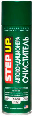 Большую популярность имеет средство для дезинфекции под названием Step up air conditioner cleaner disinfectant. Эта химия представлена в виде пены, распыляемой на испаритель и прочие элементы системы кондиционирования. Использование этого препарата несложное, но при этом получается очень эффективная обработка против бактерий и плесени. Пенная жидкость легко проникает в тонкие трубки и уничтожает самые серьезные отложения органики. Покупать его стоит вместе с освежителем воздуха той же марки. Сравнительно недорогое средство. За баллон 510 мл придется заплатить до 600 руб. Заранее купите удлинитель для шланга, потому что стандартного может быть недостаточно по длине.