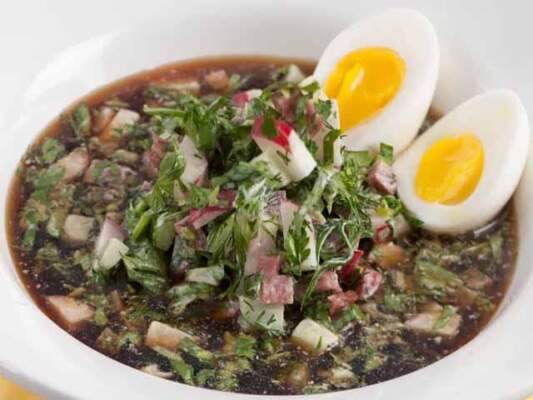 Овощи и яйца можно не нарезать, а натереть на терке или размять вилкой – так блюдо еще лучше пропитается квасом, каждый из компонентов максимально раскроет свой вкус.