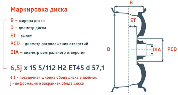 Параметры, которые указываются на колесах, также актуальны для литых изделий. Так, надпись 6jx15h2 можно расшифровать следующим образом: