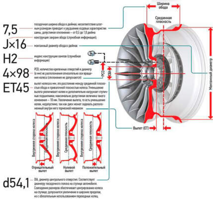 Ранее уже была описана расшифровка диска 6jx15h2, однако раскрыть особенности нанесения информации на обод нужно подробнее. У каждого параметра есть свои особенности, о которых следует знать при покупке новых колес. На примере диска с маркировкой 7,5jx16h24x98 ET 45 d54.1 далее будут рассмотрены нюансы, которые помогут расшифровать маркировку любой модели.