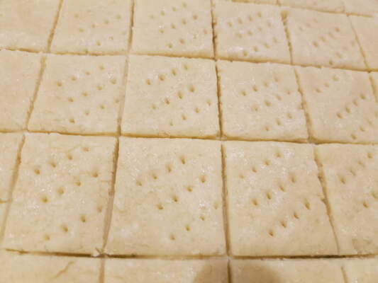 - Острым ножом наметьте линии, по которым готовое печенье будет разделено (до конца прорезать не надо). Вилкой наколите каждое из печенек.