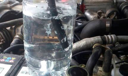 С помощью бутылки также можно обнаружить наличие выхлопных газов в системе охлаждения автомобиля. Для выполнения диагностической операции следует подготовить прозрачную емкость, наполненную на 2/3 водой. Затем следует изготовить деревянную затычку для расширительного бачка, с помощью которой можно плотно закрыть горловину. В середине самодельной пробки необходимо сделать отверстие дрелью. Диаметр сверла следует подобрать таким образом, чтобы внутри затычки шланг помещался с небольшим натягом. Плотное прилегание внешней поверхности к горловине также является залогом успешного диагностирования.