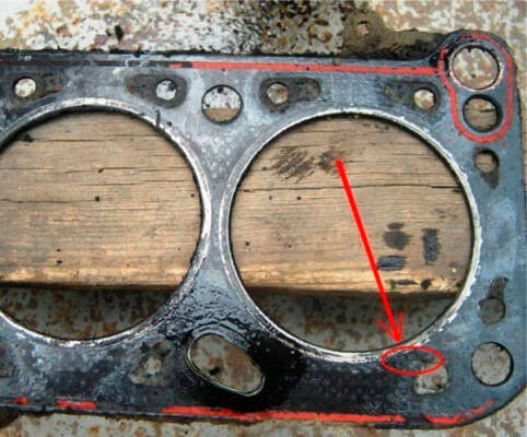 Прокладку ГБЦ может пробить в месте расположения масляной магистрали. Смазка подается в двигателе под большим давлением, поэтому даже при наличии незначительного повреждения масло начнет просачиваться в систему охлаждения. Обнаружить пробой прокладки можно по наличию масла в расширительном бачке. При незначительной утечке может обнаруживаться тонкая жирная пленка, но, как правило, такой прорыв прокладки ГБЦ сопровождается образованием значительного количества эмульсии.