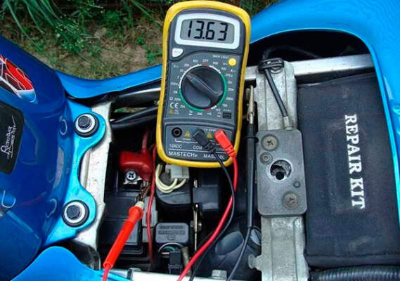 - Повысить значение оборотов коленчатого вала до 2500 об/мин. Измерить напряжение на клеммах аккумулятора (при нормально работающем реле-регуляторе прибор должен показать 14,8 вольт (допускается погрешность в 0,2 вольта)).
