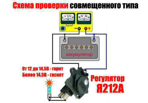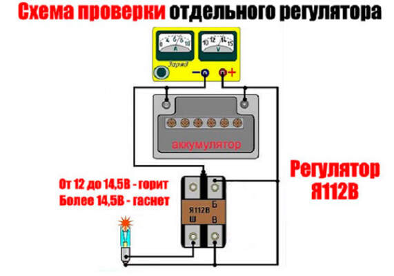 Работу реле-регулятора можно установить посредством простой схемы проверки, которая состоит из следующих деталей: