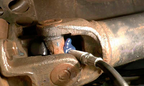 - При помощи специального шланга с насадкой выполняют прокачку крестовины. Есть модели, оснащенные накручивающимися элементами, что облегчает процесс смазывания, так как не придется усердно прижимать шприц к штуцеру. Если нет такого приспособления, то во время шприцевания инжектор нужно сильно прижимать к масленке на крестовине и одновременно нажимать на рычаг пистолета.