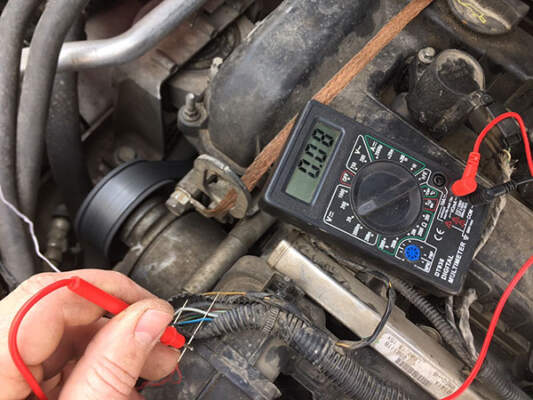 - В первом случае проверка выполнялась со снятым питанием, но также можно произвести диагностику и с включенным разъемом. В таком случае минусовой контакт ставят на массу, а плюсовой на сигнальный выход датчика. При изменении угла положения дросселя на мультиметре будут появляться цифры от 4,8 до 5,2 В.