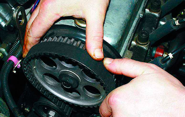 Выполняя установку нового ремня, его необходимо ориентировать по часовой стрелке. Сделать это можно по надписям, располагая ремень так, чтобы их можно было прочитать или найдя на ремне специальные стрелки, указывающие на радиатор. Сначала надевают ремень на шестерню коленвала, затем распредвала, огибая направляющую шестерню и ролик. Последний при помощи специального ключа натягивают, возвращая его на 90 градусов обратно, и фиксируют в таком положении ключом на 17. Проверить силу натяжения можно без специальных приборов. Для этого нужно взять ремень двумя пальцами и повернуть его на 90 градусов. Если это удается почти сделать, то ремень натянут нормально.