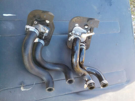 - При помощи инструмента необходимо расслабить хомуты и снять шланги с крана. Будет литься тосол, требуется подготовить тару.