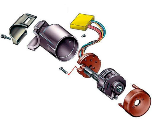 Замок зажигания устроен несложно. Всего несколько элементов позволяют обеспечить блокировку возможности запуска стартера без ключа и зафиксировать рулевое колесо.