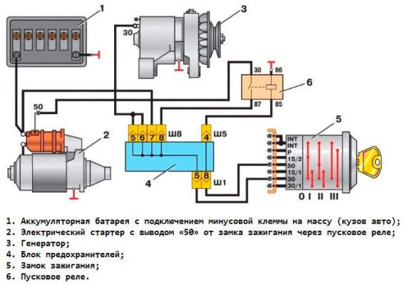 На электрической схеме замка зажигания подключаемые провода могут быть обозначены следующим образом: